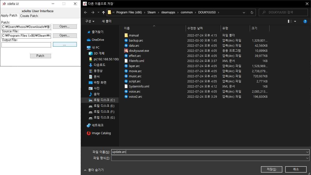 3-3. Output File 경로에 동급생 리메이크 설치 경로에 update.arc로 지정합니다.