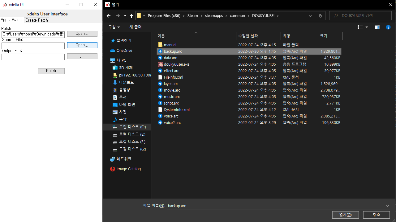 3-2. Source Files 경로에 동급생 리메이크 설치 경로의 backup.arc(기존 update.arc에서 이름을 바꾼) 파일을 선택합니다.