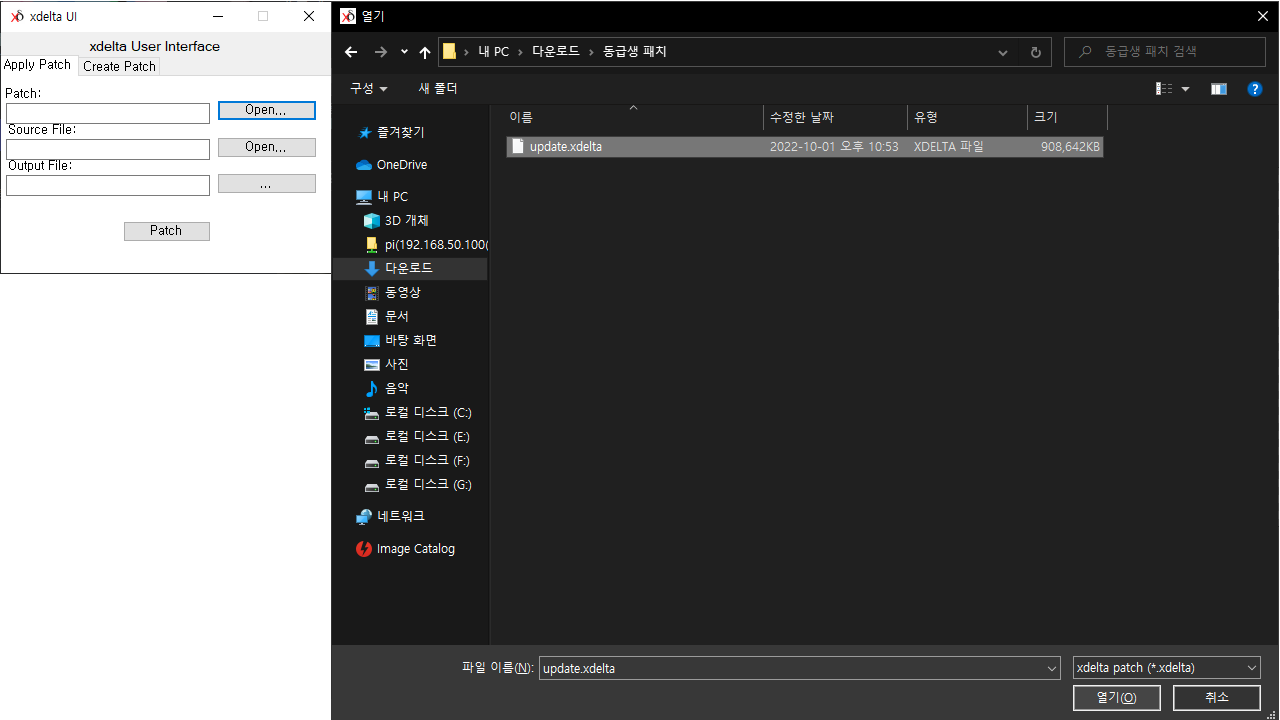 3-1. Apply Patch탭의 위 준비 사항에서 다운로드 받은 update.xdelta를 Patch 경로로 선택합니다.